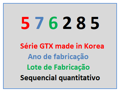 Analisando os números seriais de forma sequencial, notei que o segundo numeral começava pelo 4, ia para 5, depois para 6, 7, até 8. Mas o detalhe é que não encontrei nenhum 0, 1, 2 ou 3. O menor que encontrei foi o 4, significando que o esse dígito corresponde ao ano de fabricação. Então a linha GTX começa a ser fabricada na Coréia em 1984, e até onde sei, seguiu até 1988. Se alguém souber de um serial com a segunda posição 9, então teremos aqui uma mudança.